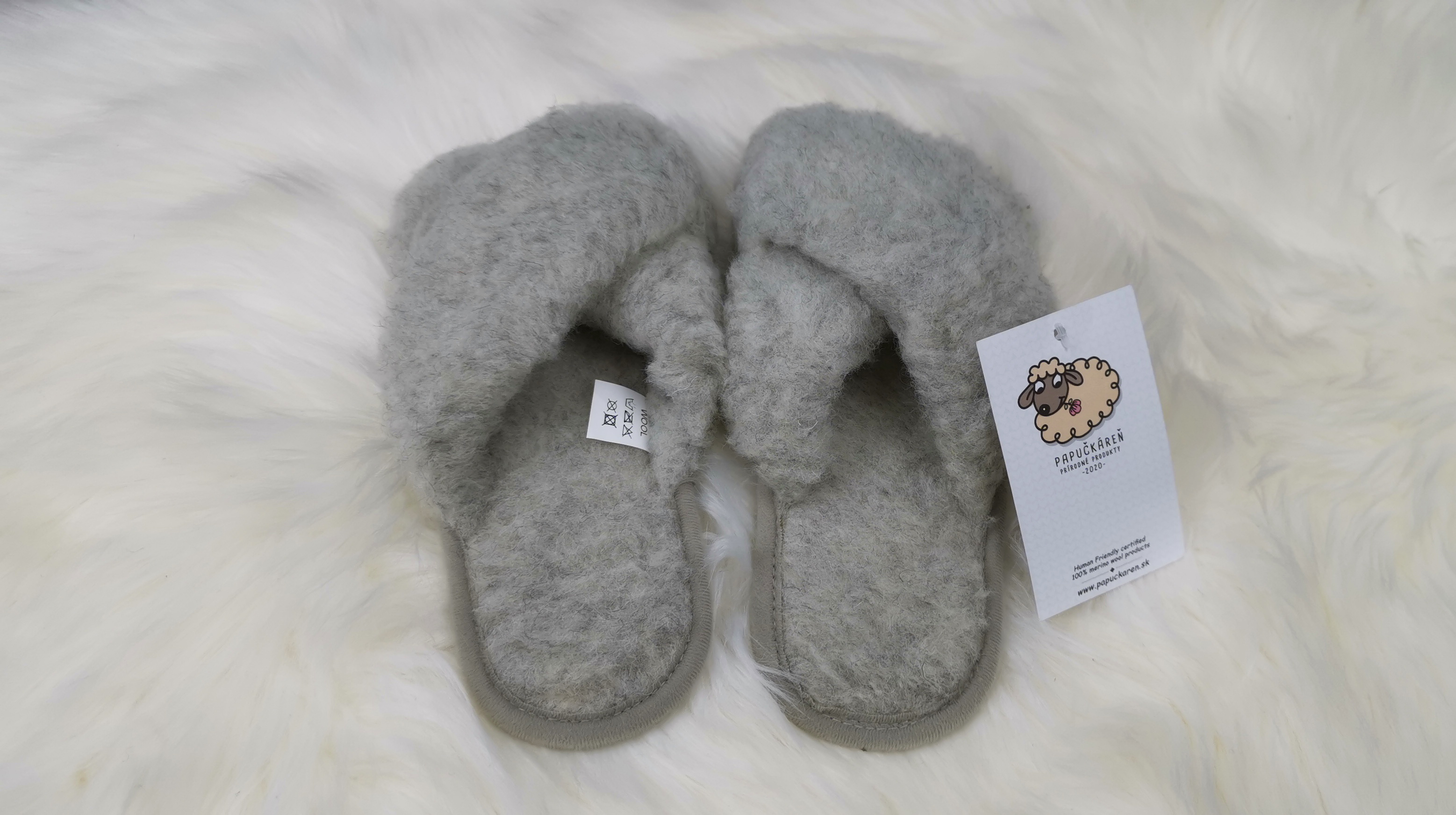 Podrážka je z kože, po obvode zakončená bavlneným lemom. Vrchná aj vnútorná časť papúč je z vlneného rúna.